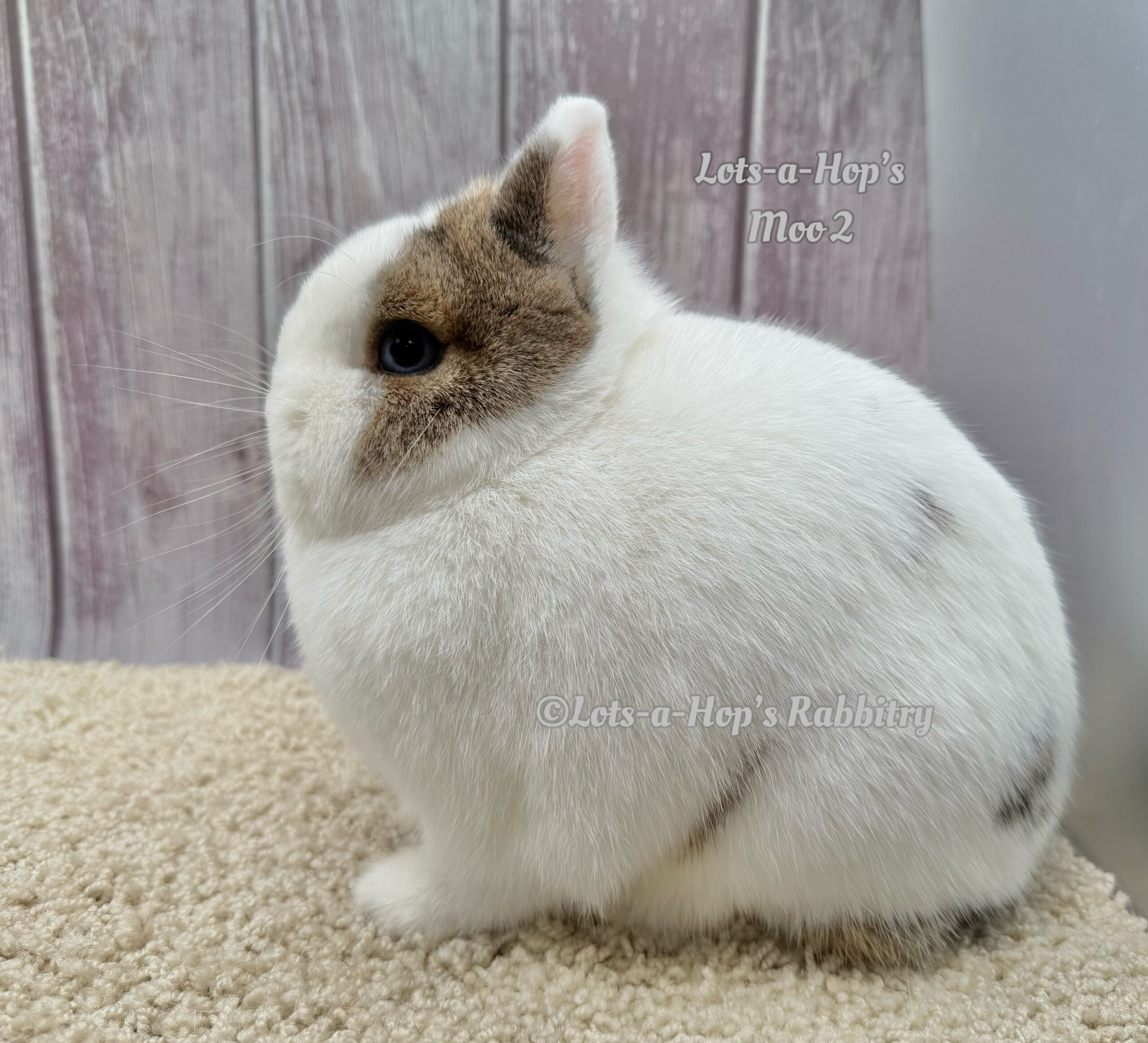 Moo 2 is a fancy-colored Vienna marked chestnut doe (not a showable color). She’s so pretty and unique, and is like a flip image of her part sister Moo. She’s very wide and smooth, has nicely furred and rounded ears and a nice head. Her fur has nice length and rollback. I’d fault her for being a tad long in her midsection, and one ear is slightly folded compared to her more open ear. Her overall type, fur quality, smoothness, and width would make a nice addition to someone’s BEW program.